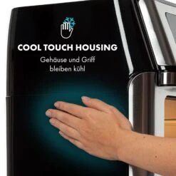 - 9 Programme wählbar: Pommes, Fisch, Pizza, Dörren & Dehydrieren, ganzes Hähnchen (Drehspieß), Hähnchen, Steak und Backen