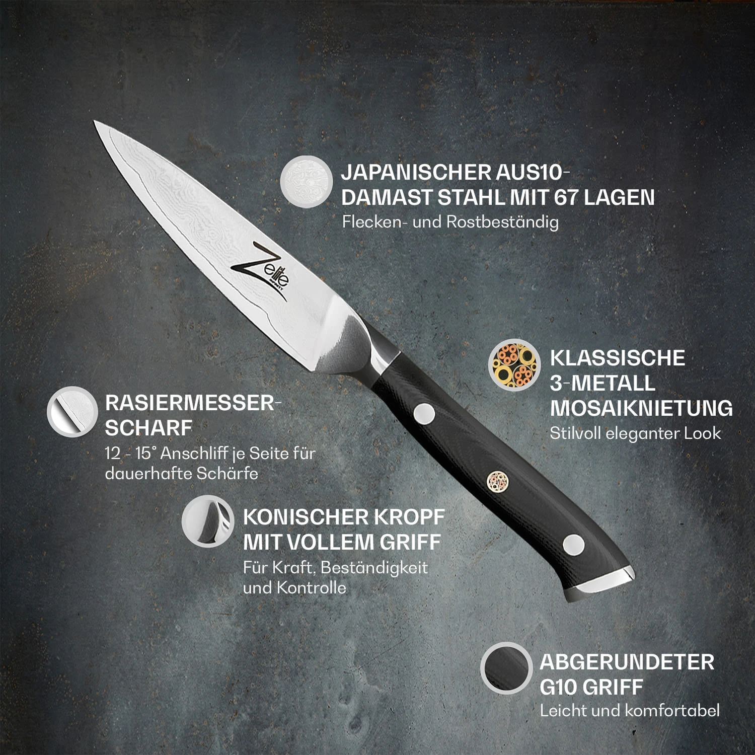 Exklusive Präzisionsmesser nach japanischem Vorbild: Die handgeschliffene Zelite Infinity by Klarstein Alpha-Royal Japanese Messerserie erfüllt hohe Ansprüche bei jeder Kochkunst. Insgesamt 67 Schichten bilden als hochwertiger, japanischer Damaszener-Stahl übereinanderliegend die changierende Klinge. Durch eine perfekt ausbalancierte und ergonomische Formgebung und einen nahtlosen, dreifach vernieteten Griff aus G10-Glasfaser liegen die eleganten Küchenwerkzeuge wunderbar in der Hand. Hier verbinden sich Schärfe, Haltbarkeit, Gewicht, Kontrolle und Handhabung mit außergewöhnlichem Design, perfektioniert durch eine kunstvolle 3-Metall-Mosaikniete im Griff.