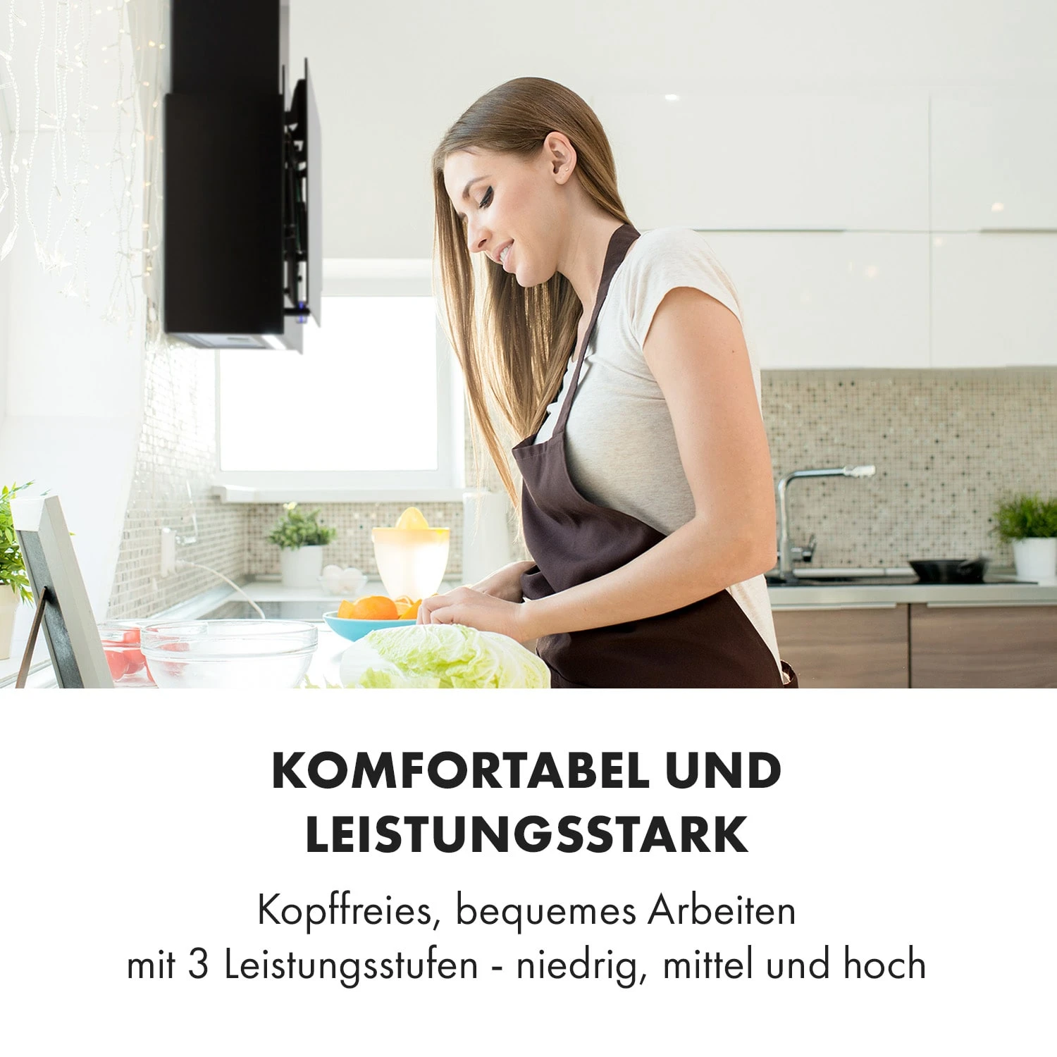 Elegant und praktisch: Das ist die Klarstein Dunstabzugshaube Amelia. Bereichere deine Küche nicht nur um einen treuen Helfer bei der Beseitigung von Dampf und Essensgerüchen, sondern auch um einen luxuriösen Blickfang über dem Herd. Anders als gewöhnliche Abzugshauben ermöglicht die Amelia durch ihr flaches Design mit nur 23,5 cm Tiefe problemlos kopffreies kochen. So hast du jederzeit auch die hinteren Töpfe gut im Blick, ohne dich bücken zu müssen oder dir den Kopf zu stoßen. Der leistungsstarke 120 Watt Motor bewältigt bis zu 586 m³ Abluft pro Stunde und ist mit nur 66 dB selbst auf höchster Stufe noch ausgesprochen geräuscharm.