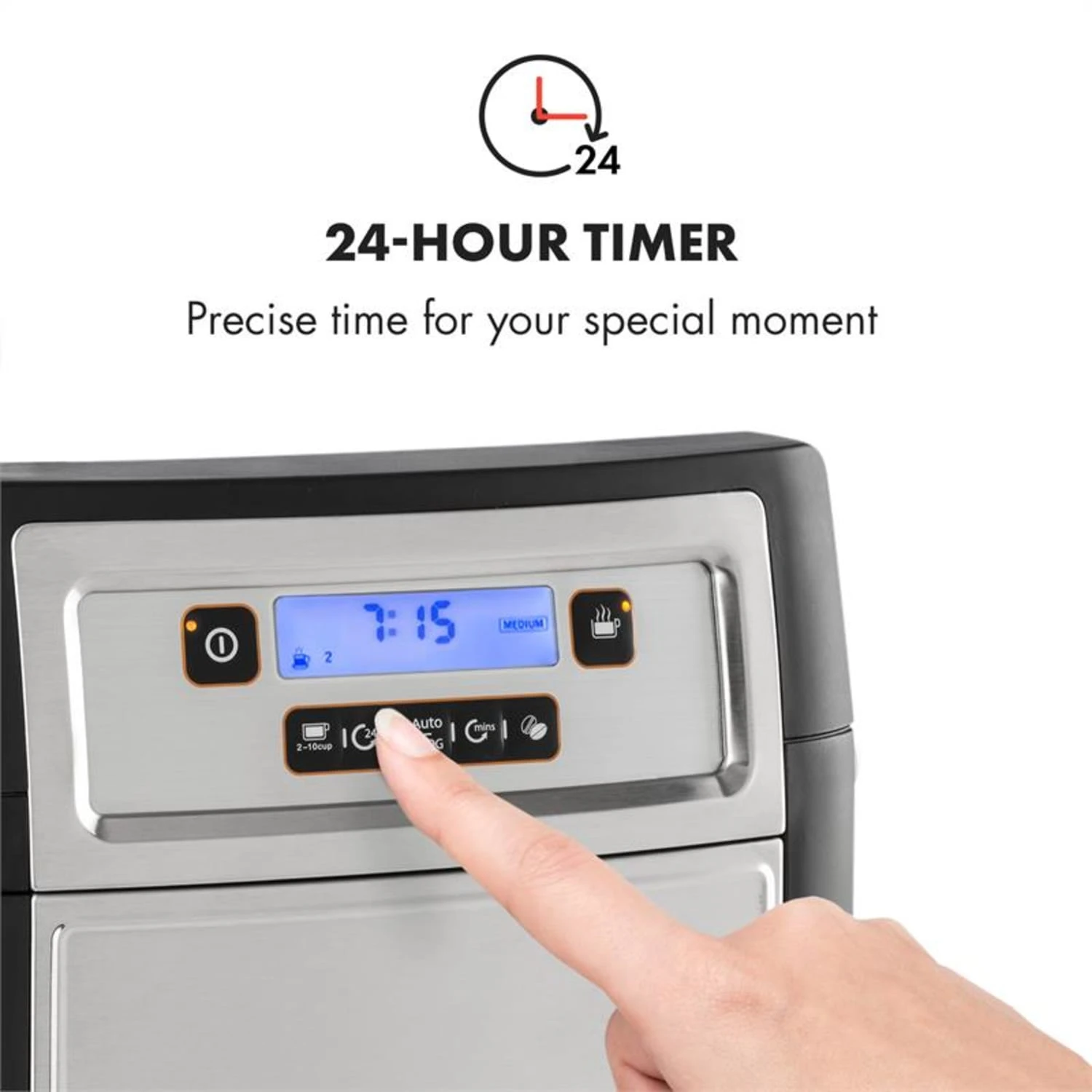 Für einen genussvollen Start in den Tag: die Klarstein Aromatica II Duo Kaffeemaschine sorgt mit einem integrierten Mahlwerk, unterschiedlichen Mahlgraden und einem praktischen Timer für einen Alltag voller belebender Momente.