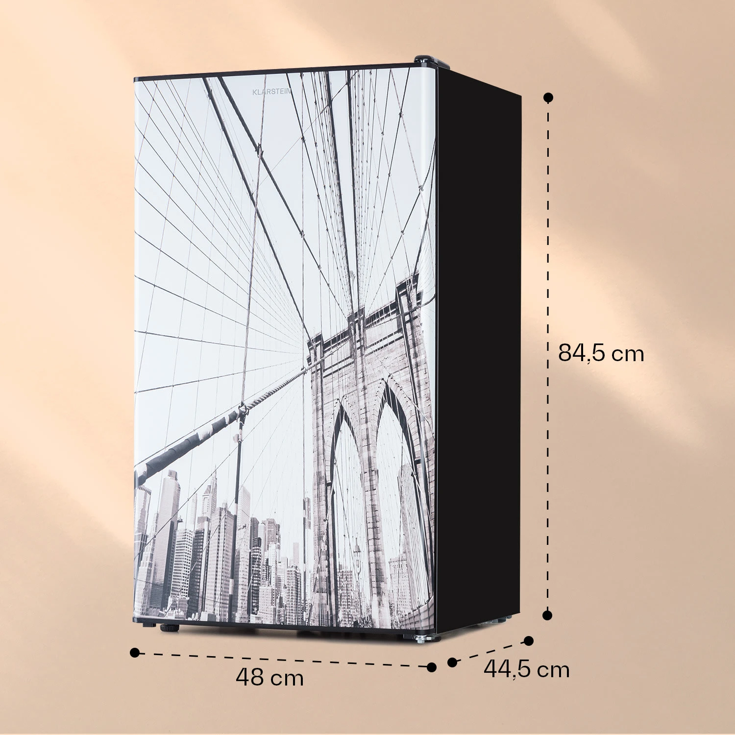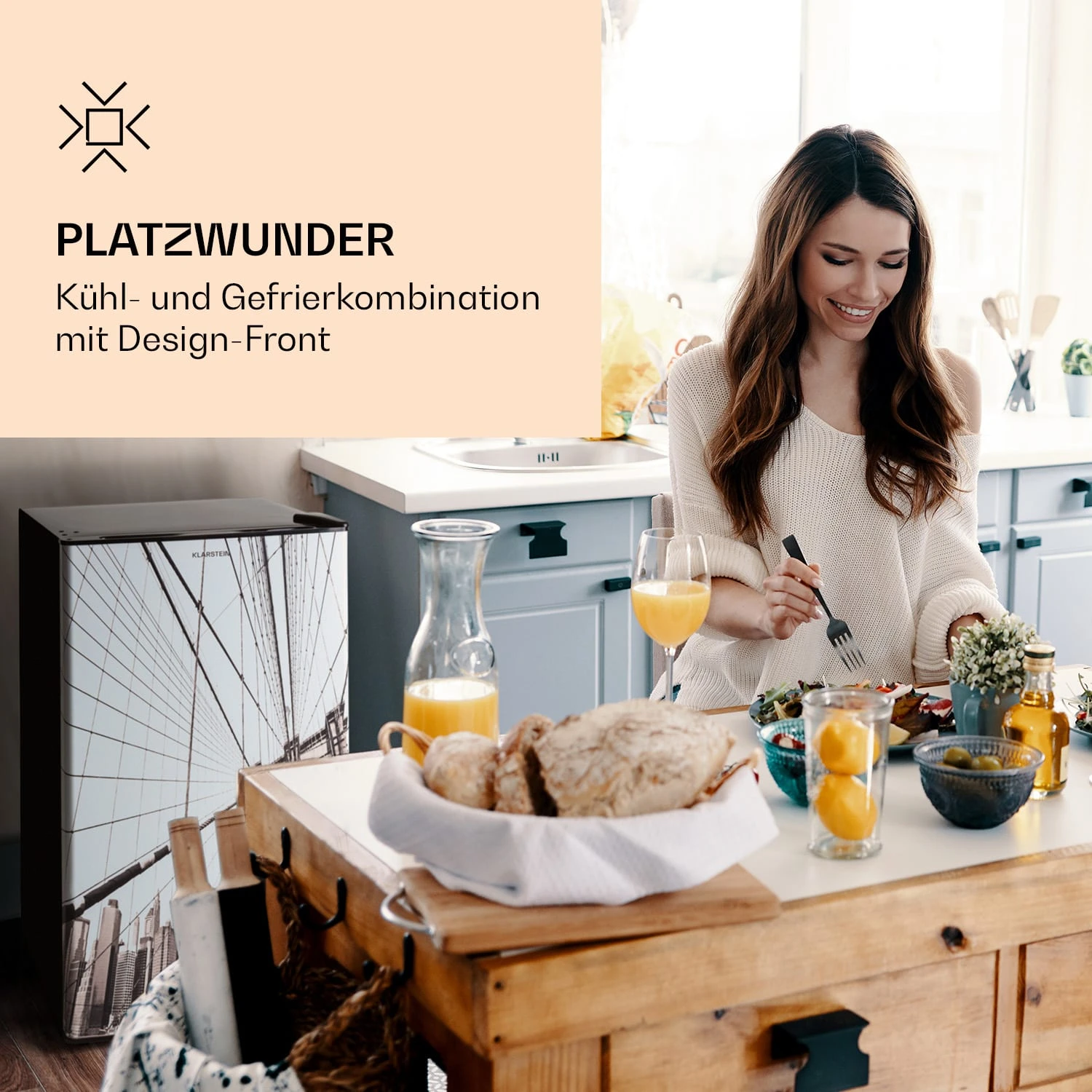Kombinierte Frische für dein Zuhause. Die Klarstein CoolArt Kühl- und Gefrierkombination vereint den Platzvorteil eines Kühlschranks mit einem 9-Liter-Eisfach und einer Design-Front, die Farbe in deine Küche bringt. Damit ist sie mit ihren 79 Litern Frischevolumen der ideale Kühlschrank für Singles, in Gästezimmern oder im Gartenhäuschen. Dank ihres geräuscharmen Betriebs mit nur 41 dB stört sie weder deine Gedanken, noch deinen Schlaf.