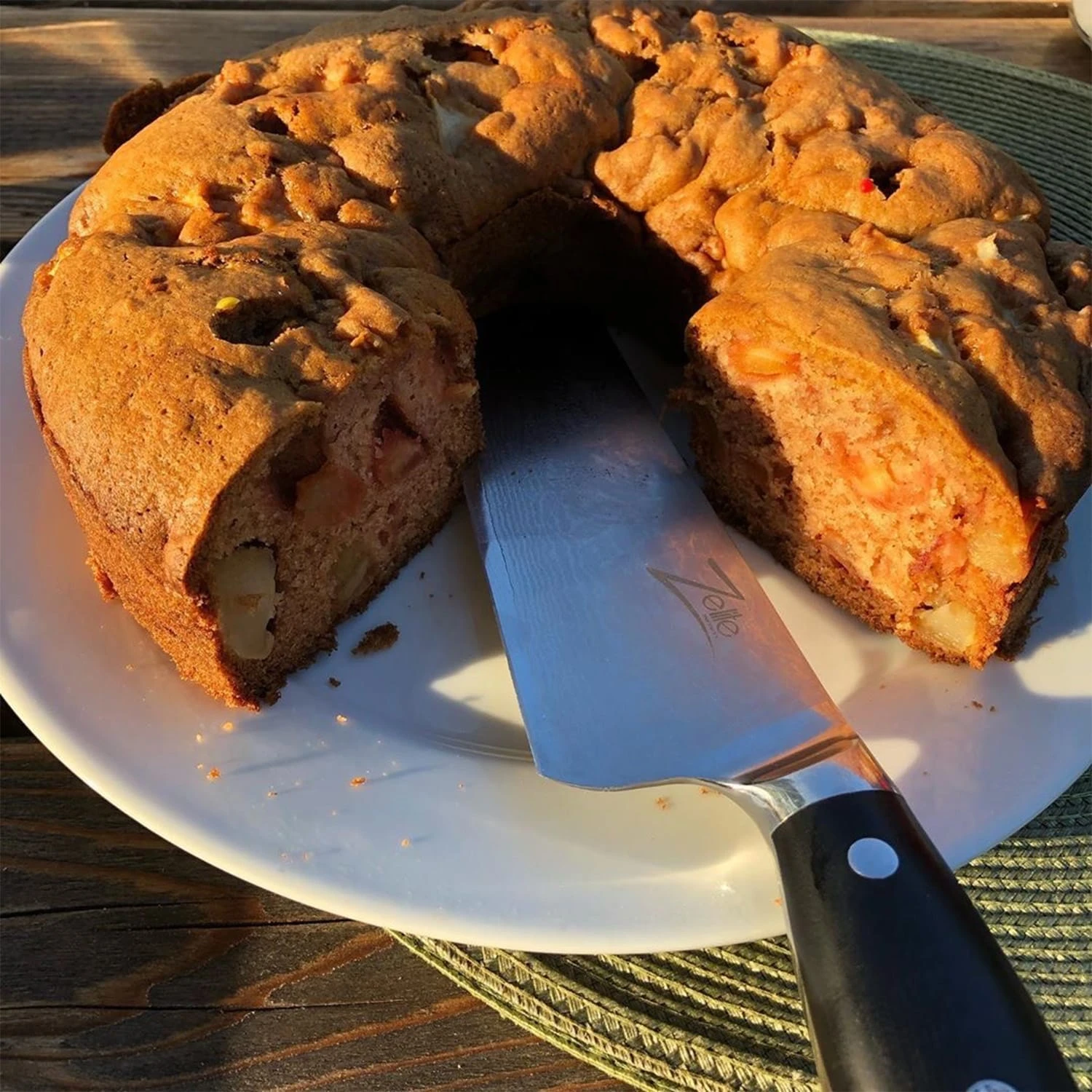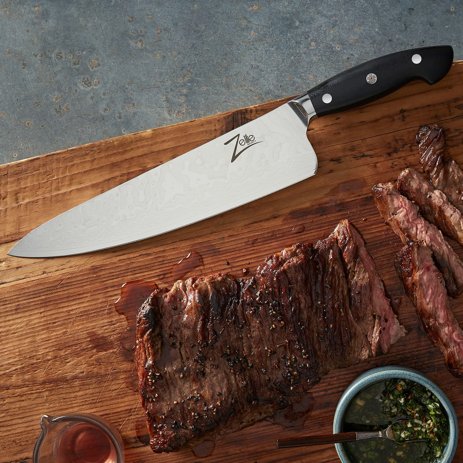 Unser 8″ Kochmesser der Executive-Plus Serie von Zelite Infinity by Klarstein besitzt eine 45-lagige Damastklinge, einen gebogenen Bauch und einen wunderschönen, ergonomischen G10-Griff mit Buckelrücken. Wir haben einen glatten, konisch zulaufenden Kropf hinzugefügt, der für den vom Küchenchef bevorzugten Kneifgriff und das Schneiden mit schaukelnden Bewegungen maßgeschneidert ist. Ob du Zwiebeln würfeln, Schweinefilet filetieren, Karotten in Julienne schneiden oder Basilikum in Chiffonade hobeln möchtest – mit dieser professionellen Klinge ist es Liebe auf den ersten Schnitt.