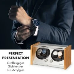 Der Hanoi 4 Uhrenbeweger überzeugt mit einem eleganten Bambusgehäuse, das sich stilvoll in jedes Raum-Ambiente einfügt. Eine Bedienfläche aus gebürstetem Aluminium verleiht der Konstruktion seinen unverwechselbaren Glanz, währende das großzügig geschnittene, von oben und frontal einsehbare Sichtfenster aus Acrylglas einen unverstellten Blick auf die Automatikuhren freigibt.