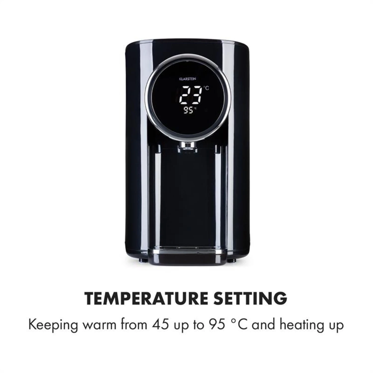 Es gibt viele Gelegenheiten, zu denen sich ein Betrieb des Klarstein Hot Spring Plus Heißwasserspenders anbietet: Schnell einen Tee in der gewünschten Temperatur aufbrühen oder Instant-Suppen mit der exakt benötigten Menge Wasser zubereiten sind nur zwei der vielen Möglichkeiten. Der große Edelstahl-Wassertank des Hot Spring PlusHeißwasserspenders nimmt dabei bis zu 5 Liter Wasser auf und eignet sich neben dem Privathaushalt auch hervorragend fürs Büro. Die Bedienung des Heißwasserspenders mit Trockengeh- und Überhitzungsschutz ist denkbar einfach: An der Oberseite befindet sich die Touch-Oberfläche mit jeweils einer Taste für Erhitzen, Temperatur (45-95 °C), Wasserausgabe, zum Lösen der Kindersicherung sowie für gefiltertes Wasser. Es müssen nur die gewünschte Füllmenge und Temperatur eingestellt und die Ausgabetaste gedrückt werden – schon erhält man sehr zügig perfekt temperiertes, heißes Wasser. Dadurch ist die Handhabung kinderleicht und wird schnell zur angenehmen Routine. Die Tropfwanne kann mit einem Handgriff abgenommen und bei Bedarf gespült werden, während die vielfältigen Funktionen wie schnelles Abkühlen sowie der Wasserstands-Alarm die Bedienbarkeit des Gerätes zusätzlich erleichtern. Durch sein großes, übersichtliches Display werden nicht nur alle wichtigen Informationen jederzeit im Blick behalten – der Heißwasserspender wird dadurch auch zum besonderen Blickfang und fügt sich nahtlos in jedes Küchenambiente ein.