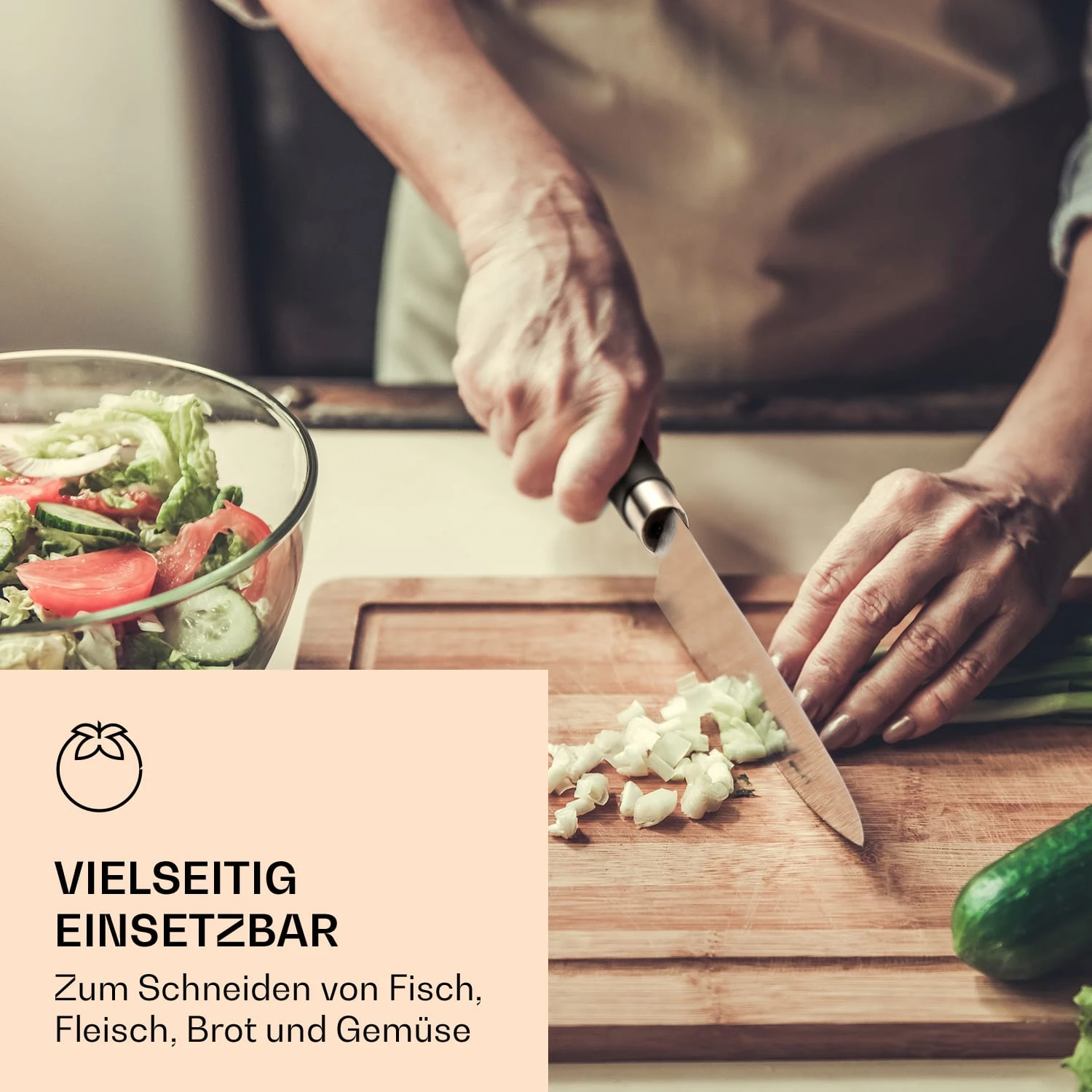 Höchster Genuss aus frischen Zutaten verlangt nach dem richtigen Messer. Dafür enthält der Kitano XL Messerblock von Klarstein 12 Modelle mit verschiedenen Präzisionsklingen aus gehärtetem Stahl. Durch die ergonomische Form und das rutschfeste Material liegen die Messer perfekt in deiner Hand.