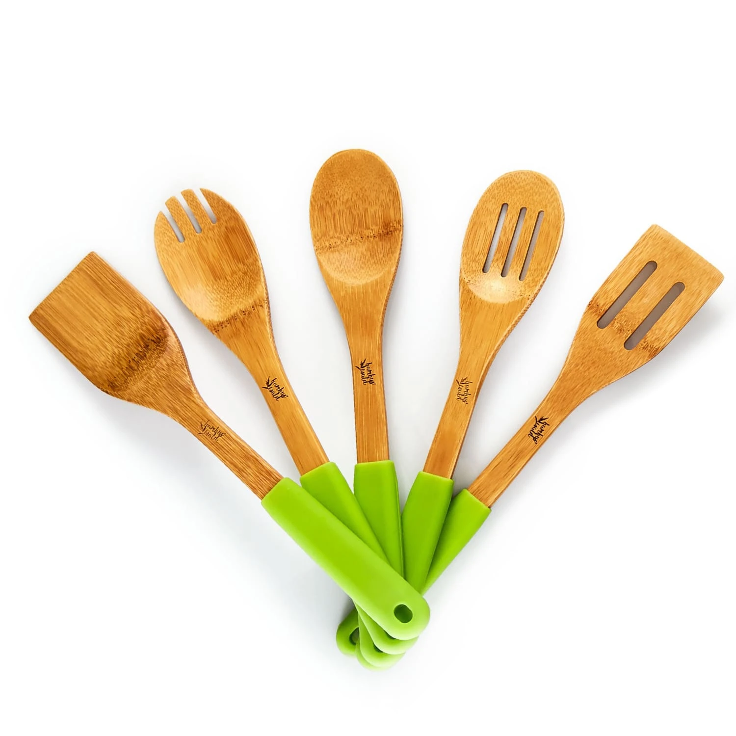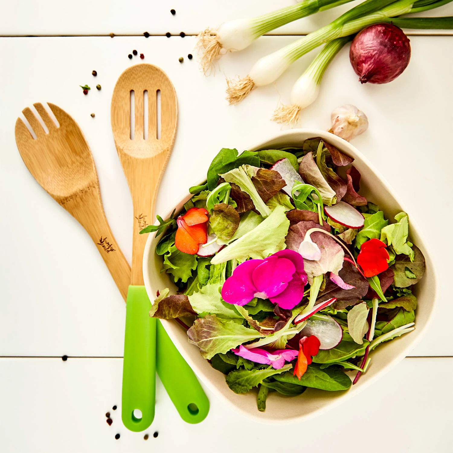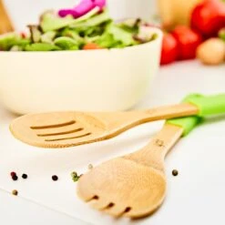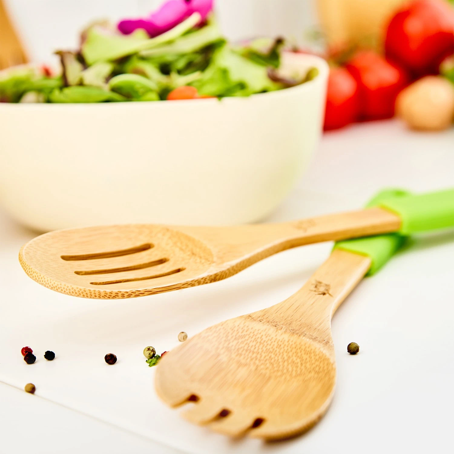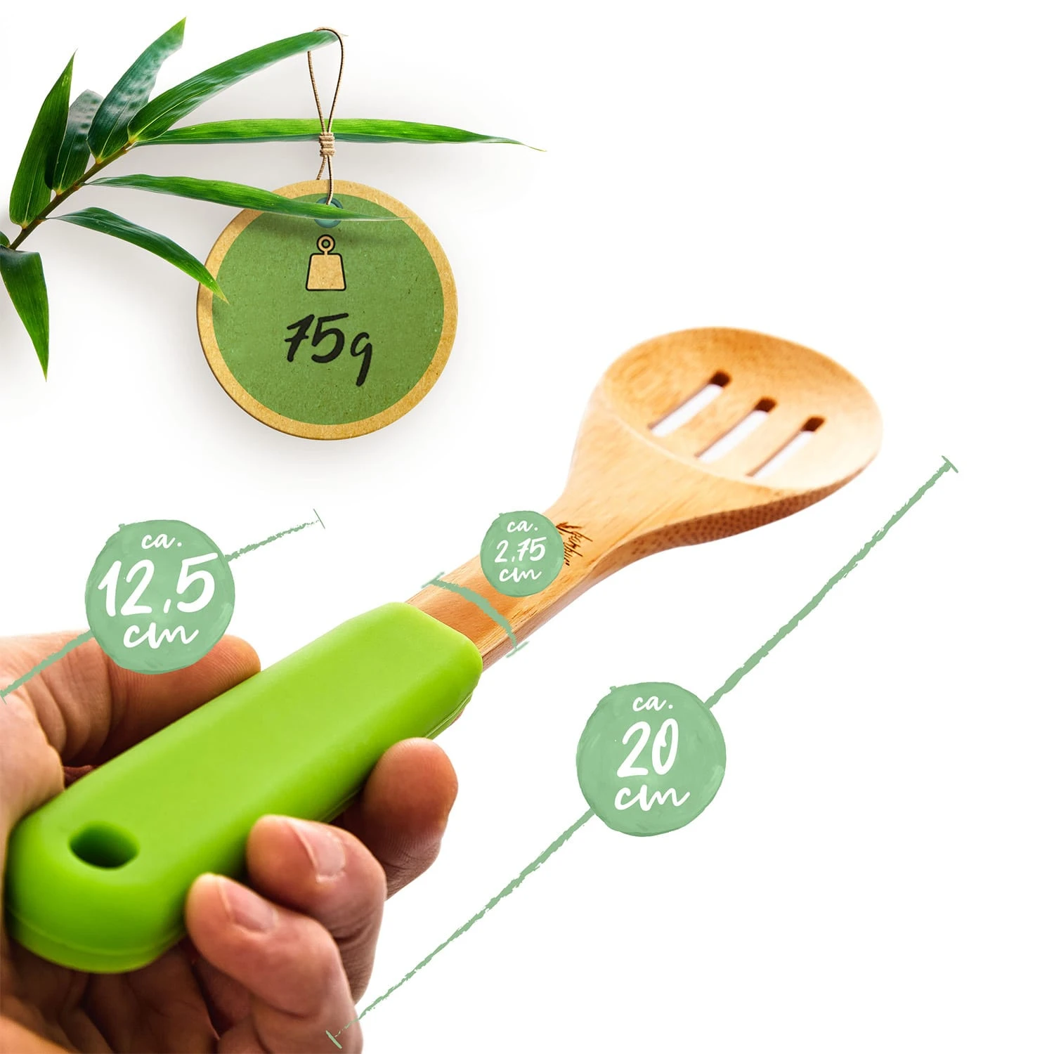 Nicht nur für begnadete Köche: Das alltägliche Kochen wird durch das Küchenzubehör mit Silikongriff von Klarstein stark erleichtert und verschönert. Entdecke das hilfreiche Set in fantastisch natürlichem Design. Denn das günstige Set aus Pfannenhebern und Salatbesteck sollte in keiner Küche fehlen. Dank der angenehmen Silikongriffe liegt es wundervoll in der Hand. Die Beschaffenheit aus Bambus sorgt dazu für eine geschmacksechte Zubereitung der Speisen und lässt sich leicht reinigen. Für lange Freude an deinem neuen Küchenzubehör empfehlen wir dir, das Besteckset per Hand abzuwaschen. Reibe das unbehandelte Holz hier und da mit etwas Speiseöl ein.