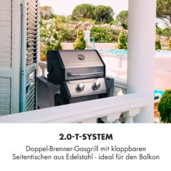 Grillen auf offener Flamme ohne Kohlestaub und Fummelei beim Anzünden? Mit dem Klarstein Lucifer 2.0-T Gasgrill ganz einfach. Dank SNAP-JET-Ignition-System mit integrierter Piezozündung werden einer oder beide Brenner per Knopfdruck entzündet. Der Grill abreitet dank Gasbrennern mit dem InstantReady Concept das heißt, er ist sofort einsatzbereit, ohne lange auf das Durchglühen der Kohle oder Aufheizen der Grillplatte warten zu müssen. Beide Brenner sorgen jeweils mit 3,5 kW Heizleistung für Grillhitze unter dem gusseisernen Grillrost. Der bietet sich mit 45 x 44 cm Fläche für verschiedenstes Grillgut an: herzhafte Steaks, knackige Würste, leckeres Grillgemüse oder saftiger Fisch. Die große Grillplatte aus emailliertem Gusseisen sorgt für eine gleichmäßige Verteilung der Hitze, sodass auch in Randlagen der Grillzone alles schön kross gebraten wird. Mit der großen, doppelwandigen Edelstahl-Haube sind auch Spezialitäten des passiven Grillens wie Pulled Pork oder SpareRibs kein Problem. Das integrierte Thermometer erleichtert dabei die Temperaturüberwachung. Ist der Grill zu heiß oder zu kalt, wird einfach an den stufenlosen Drehschaltern nachjustiert. Für viel Platz beim Grillen sorgen die beiden Seitentische aus Edelstahl, die nach Belieben ein- oder ausgeklappt werden – perfekt für Balkone mit kleinem Platzangebot. Jeder Seitentisch stellt 32,5 x 45,5 cm Abstellfläche zur Verfügung – genug für Schüsseln, Pfannen, Besteck, Getränke oder Gewürze. Haben wir an alles für Ihr perfektes Grillerlebnis gedacht? Na klar, denn der Lucifer 2.0-T besitzt auch noch einen integrierten Flaschenöffner für die schnelle Erfrischung, vier Haken zum Aufhängen von Grillzange, Spießen oder Pfannenwendern, einen emailierten Warmhalterost für fertiges Grillgut und ein Gewürzregal für Pfeffer, Salz, Öl, Dressing und was Sie sonst noch brauchen – hier ist einfach alles am Grill und alles zur Hand!