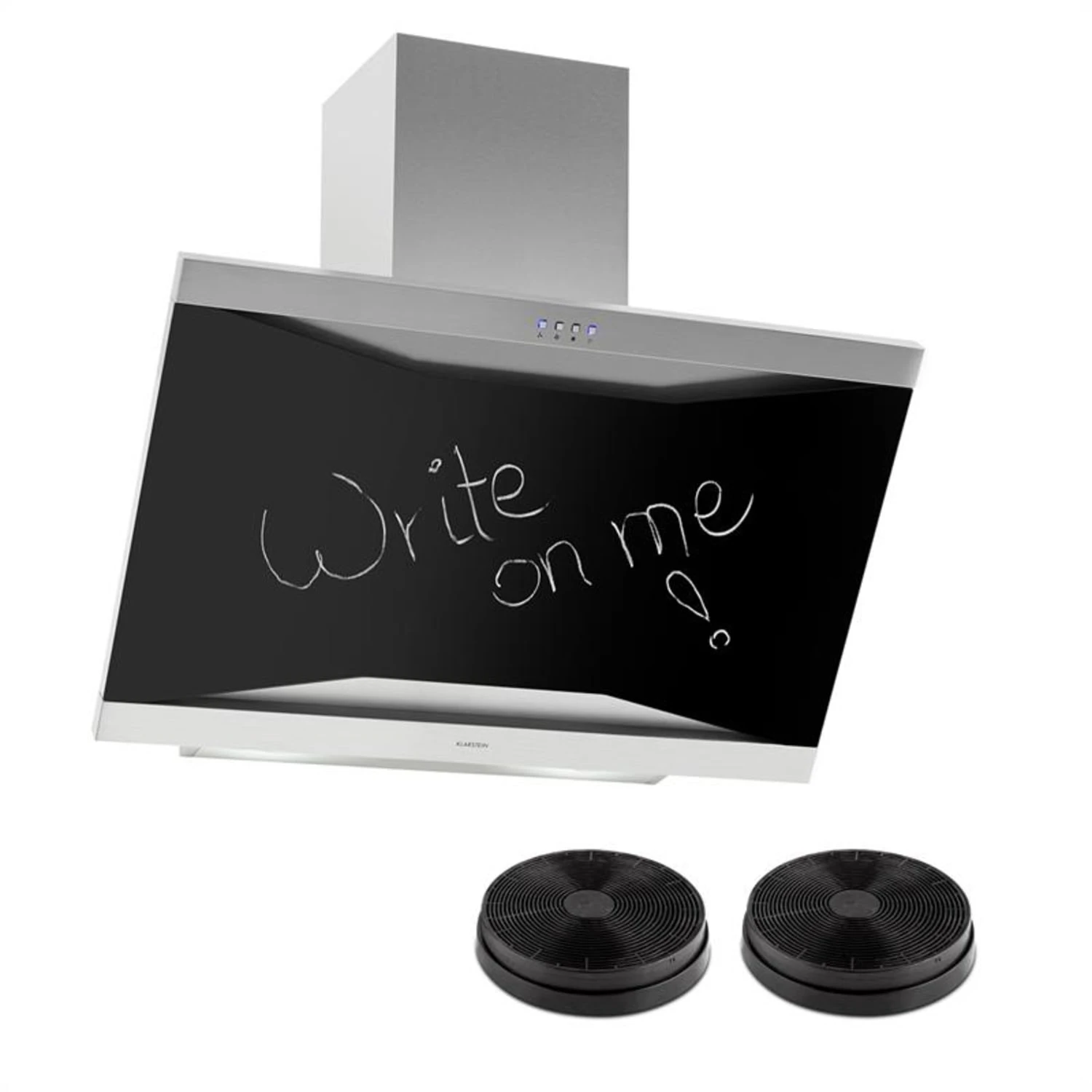 Die schwarze Front der Masur Dunstabzugshaube ist mit Kreide beschreibbar: Somit können bei Bedarf jederzeit wichtige Notizen für alle sichtbar auf der Tafeloberfläche festgehalten werden. Für unterschiedlich starke Kochaktivitäten kann sie mit 3 verschiedenen Leistungsstufen betrieben werden. Die höchste Leistungsstufe befördert bis zu 650 m³/h Abluft aus der Küche und wird auch mit der Zubereitung mehrerer Gänge fertig. Der Stromverbrauch hält sich dank Energieeffizienzklasse A in Grenzen, auch die optional zuschaltbare Beleuchtung mit 2 LEDs ist äußerst stromsparend bei gerade einmal 2W.